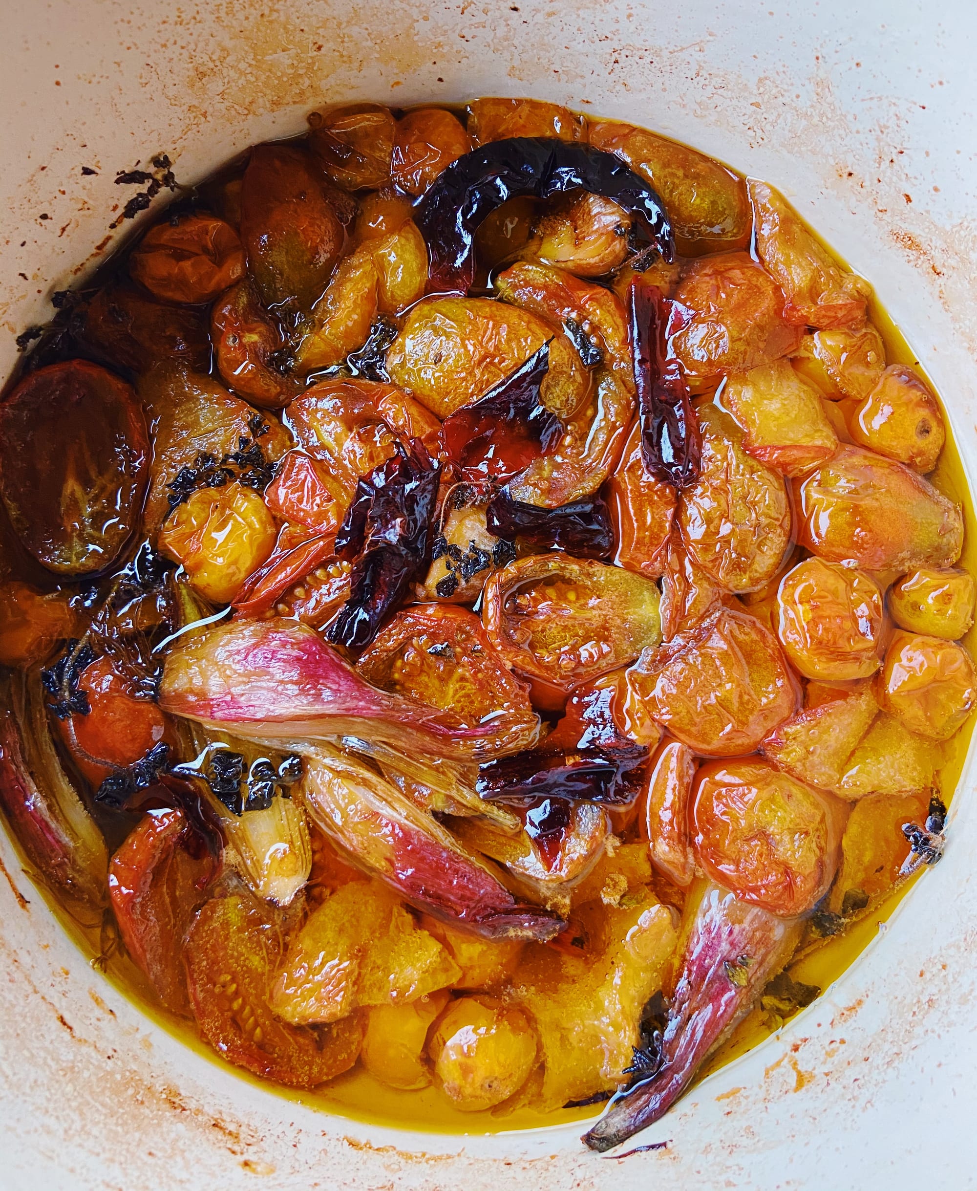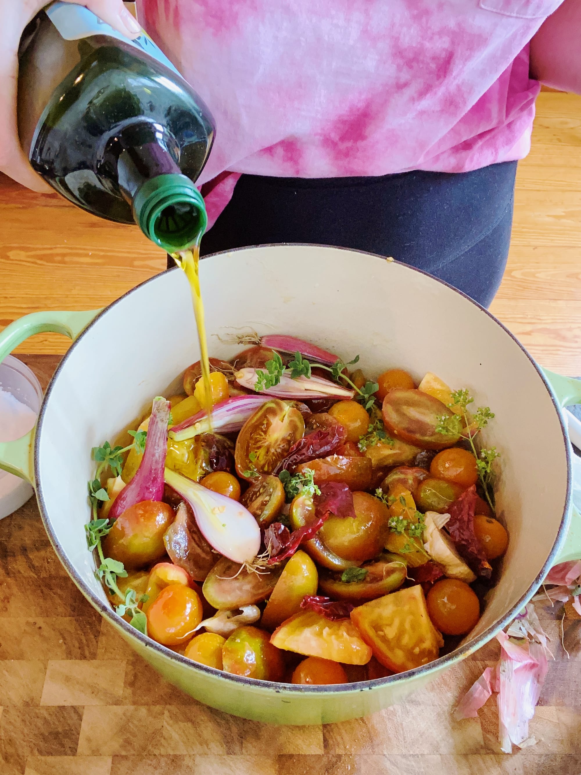 Wash the tomatoes, take the stems off, remove any egregiously thick cores. Small tomatoes go in whole, medium ones get halved or quartered, larger ones get cut into 2-inch pieces. Put them into a large dutch oven or baking dish (or pie plate, or cake pan— anything goes, really. Avoid cast iron, as it’ll react with the acidity of the tomatoes).