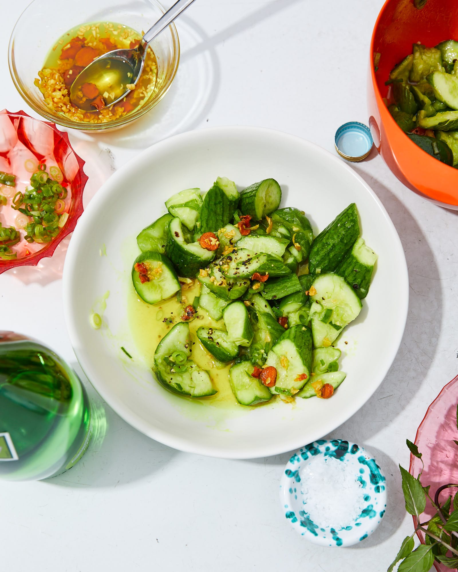 Cut the cucumbers into 1-inch chunks, then gently smash them using the side of your knife until they split. Transfer to a medium bowl and season with salt, then set aside while you prepare the rest of the salad. You can also place the cucumbers in a large resealable plastic bag and season with salt. Using a heavy skillet, rolling pin, or anything heavy, smash the cucumbers until they split and explode a bit, pick your pleasure! Let them sit a few minutes to release some of that water and season deeply.
