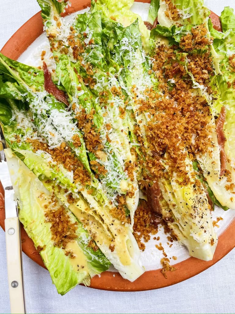 The dressing is creamy without being thick or mayo-y in texture, it’s punchy with mustard, garlic and anchovy and salty with that sweet, sweet Worcestershire. The dressing is classic in all the right ways with the exception of leaving out the cheese (because I don’t like a clumpy dressing and prefer it showered over the whole salad instead), so I leave the rest to you. Crouton vs. breadcrumb (breadcrumbs are just tiny, tiny croutons), romaine vs. Little Gem vs. bitter greens vs. a bowl of thinly sliced celery (all are perfect actually), more anchovies on top or not (more on top) are your own battles to fight.