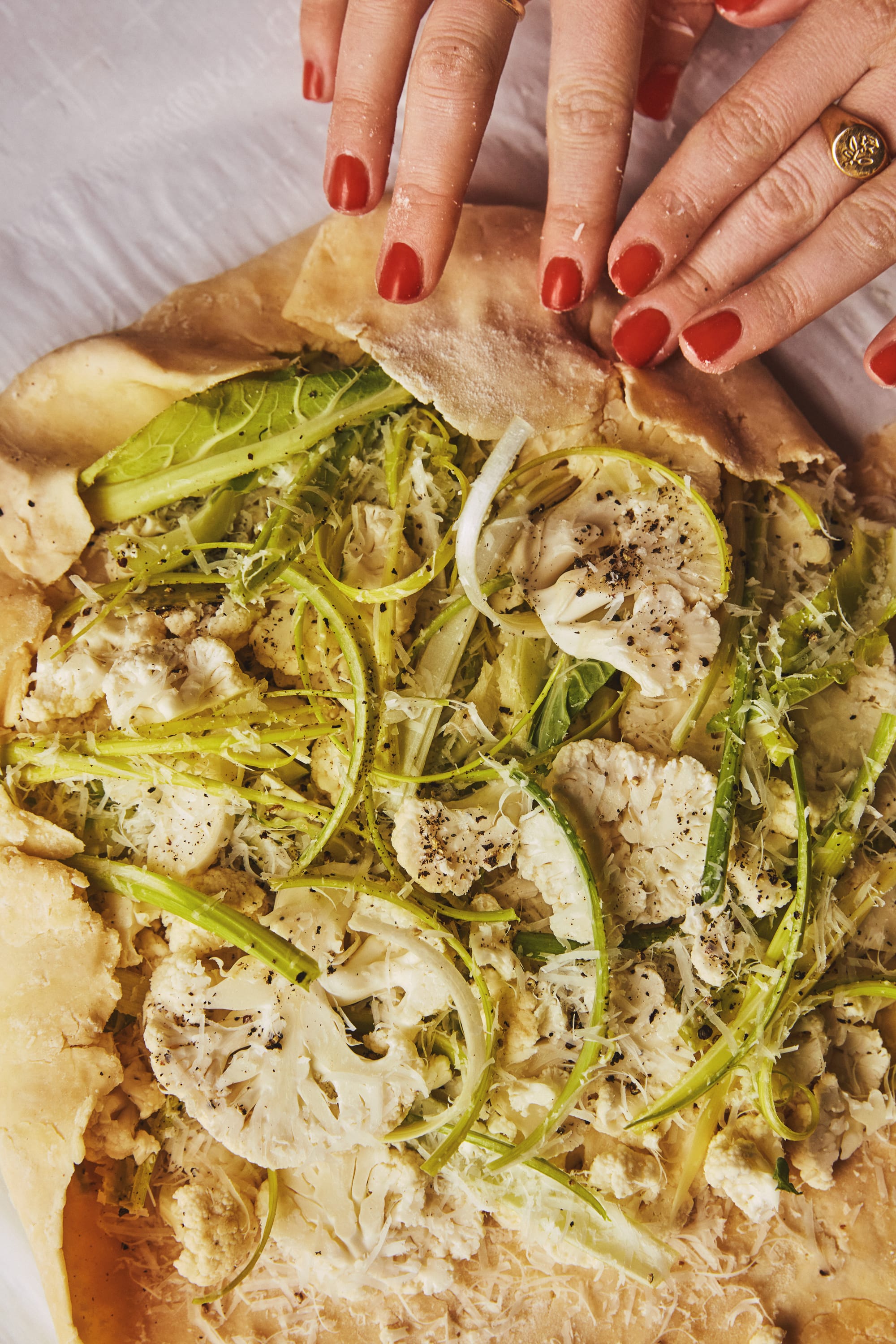Cauliflower is an ideal candidate for a savory galette. It’s low in moisture, roasting to an evenly golden brown in sync with the crunchy, buttery crust. It never becomes soggy, is great at room temperature, and can handle a healthy amount of cheese without disappearing into the background. This is the galette you make when you need something substantial and comforting, don’t feel like eating meat, and have had too much pasta or are—god forbid—sick of beans. While this certainly could be served as your full dinner, I also like the idea of slicing it thin and enjoying it as a pre-dinner snack, next to a little dish of olives and some hard, salty cheese.
