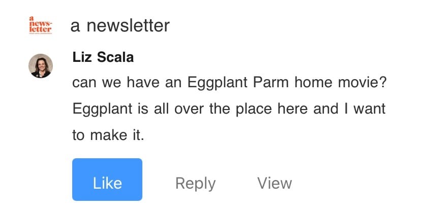 Yes, despite being from the San Fernando Valley (818!), I loathe abbreviating words because I am an adult woman, aged 35 years. That said, “Eggplant Parmesan” feels formal, like I’m using its full name because it’s in trouble, so “Eggplant Parm” it is. This is my one exception to the rule.