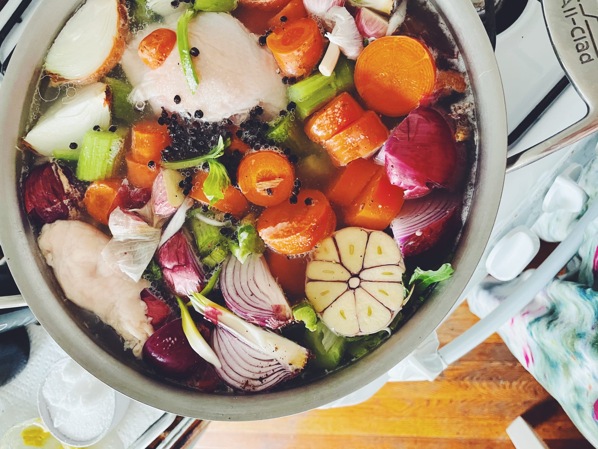- Place chicken, onions, garlic, celery, carrots, peppercorns and bay leaves, if using, in a large pot and cover with 10–12 cups water (basically you want to fill your pot to the top with water, this should take 10–12 cups.)