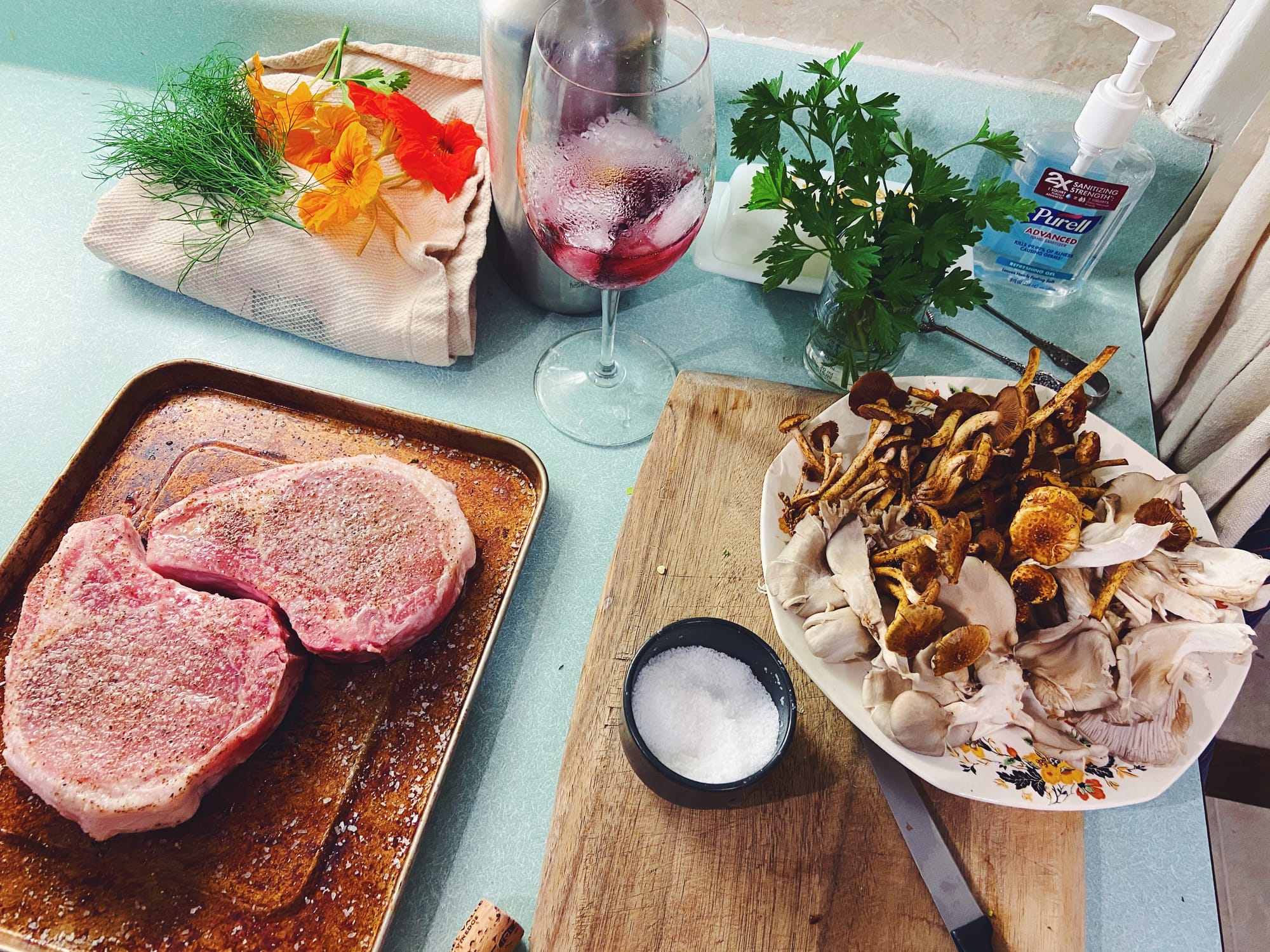 Let’s make it pork chops. Ditch the brothy vibe, keep the peas. Sounds good. “We picked and ate all the peas last night,” my friend said. Okay, pivot again. We found beautiful chestnut mushrooms from Moorit Hill that look like teeny chanterelles but taste like shiitake. Okay, but that’s feeling wintry. Pivot. Let’s cook the mushrooms in the pork fat rendered from the chops, add vinegar and herbs and make the whole thing more salad-y. That’s right, another salad. Love it. ABP. Always Be Pivoting.