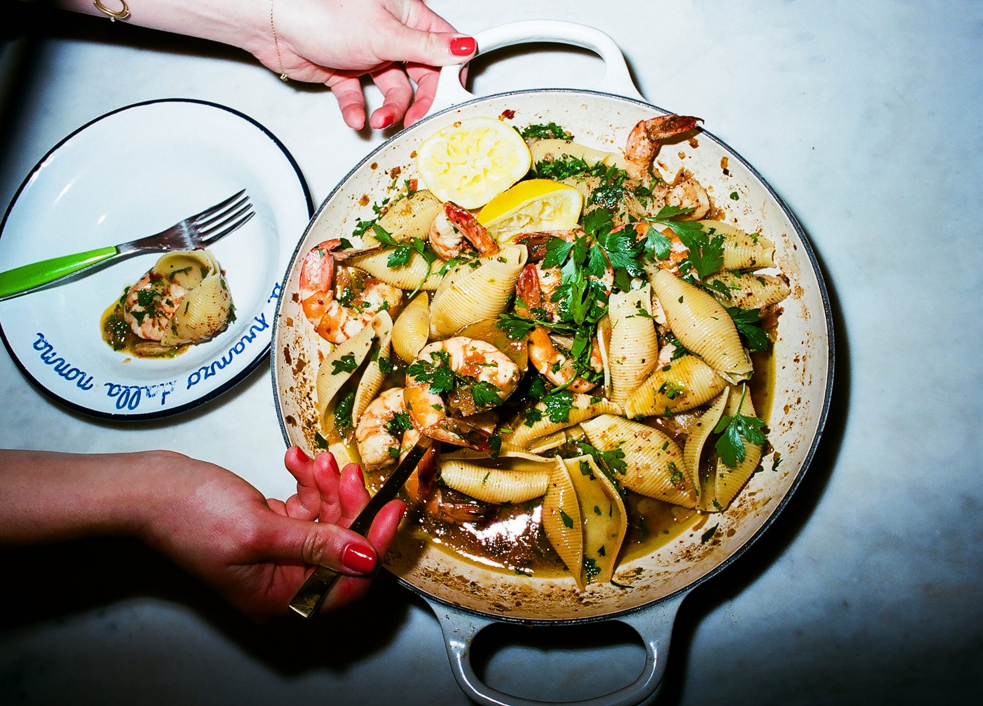 I’m guessing it was the jumbo shells I used instead of long strands of skinny pasta (shrimp in their shells except the shells are pasta and you eat them haha do you get it). Using those big dumb pieces of pasta (a shape I have historically ignored except to stuff with cheese and cover with herbs), felt silly and campy in a Met Gala 2019 kind of way and you know what: I loved it. It was fun, I was having fun, me and my big dumb shells were having fun.