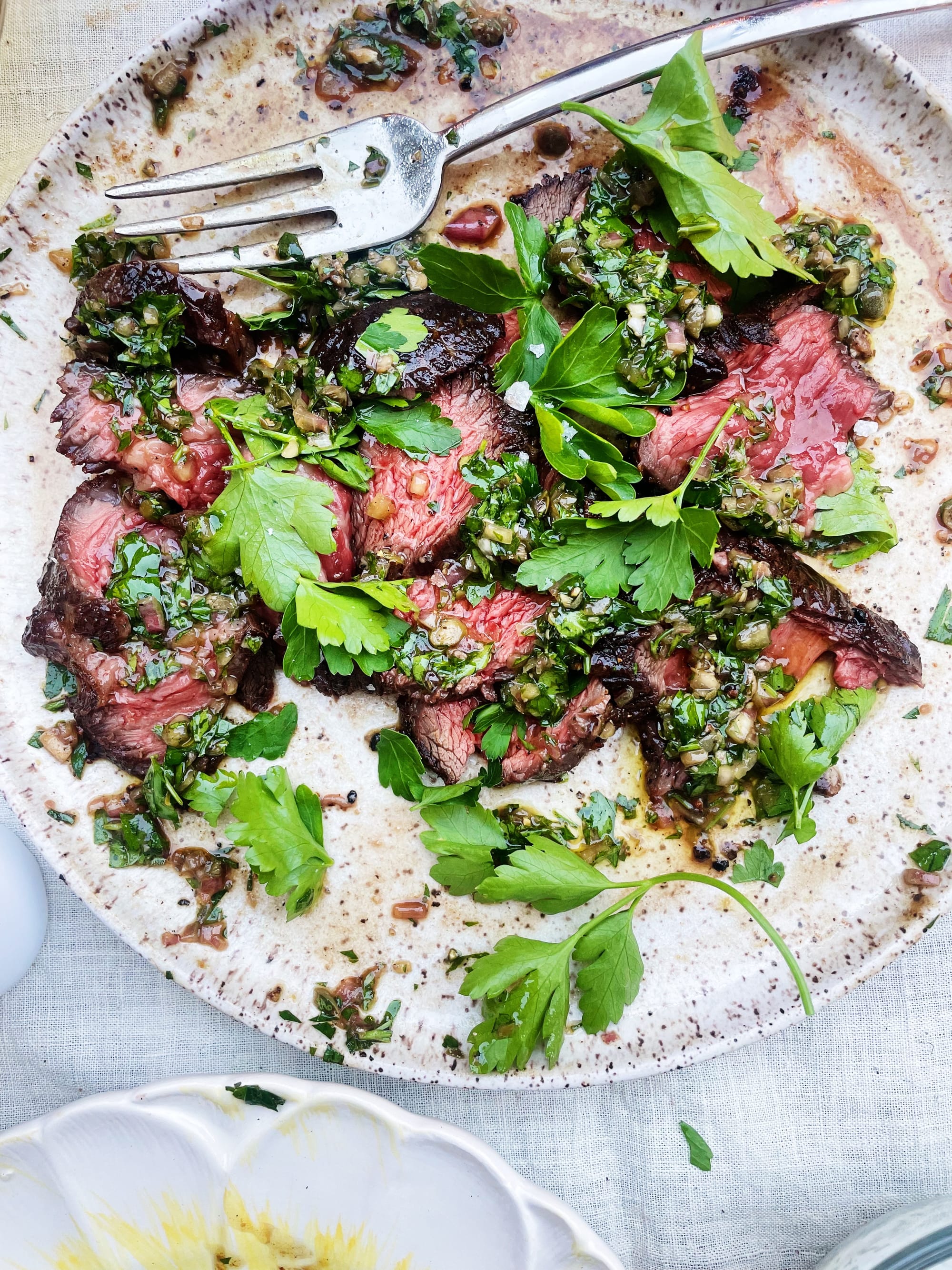 4. While the steak rests, make the sauce(!). In a medium bowl, combine shallot, capers, anchovies, 2 tablespoons vinegar, ½ teaspoon Worcestershire, chives, and parsley. Stir in olive oil along with any meat juices from the plate the steak is resting on. Taste the sauce and season with more vinegar, Worcestershire, salt and pepper as needed. Steak Like Tartare seasoning (like tartare) is deeply personal and should be adjusted to suit you and your loved ones.