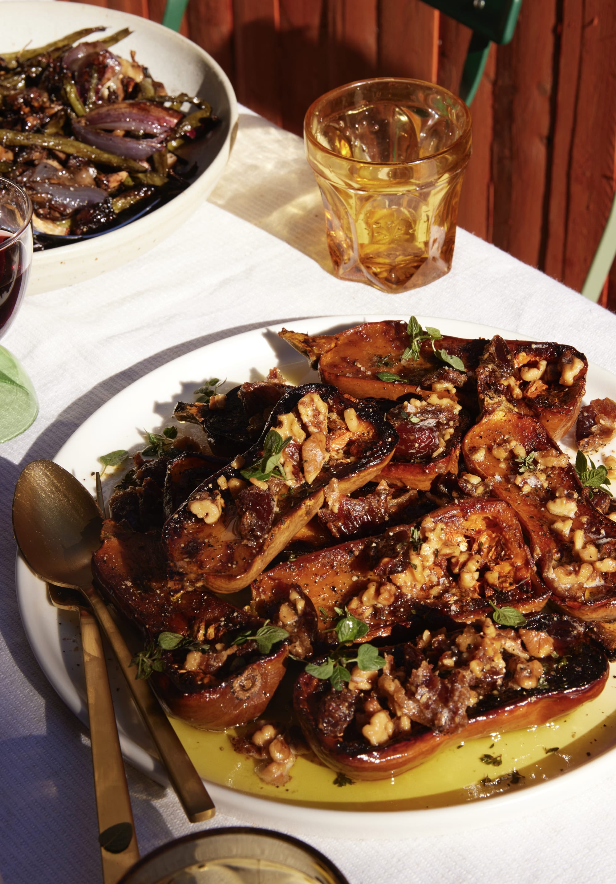 Three sides, to be exact, all with their own precise and unique role to fill. Roasted squash with brown butter walnuts and sticky dates (sweet, tender, salty). Roasted green beans and mushrooms (frizzled, crispy, savory). Leek and greens gratin (crunchy, creamy, green). If someone suggests you only need one side, reschedule.