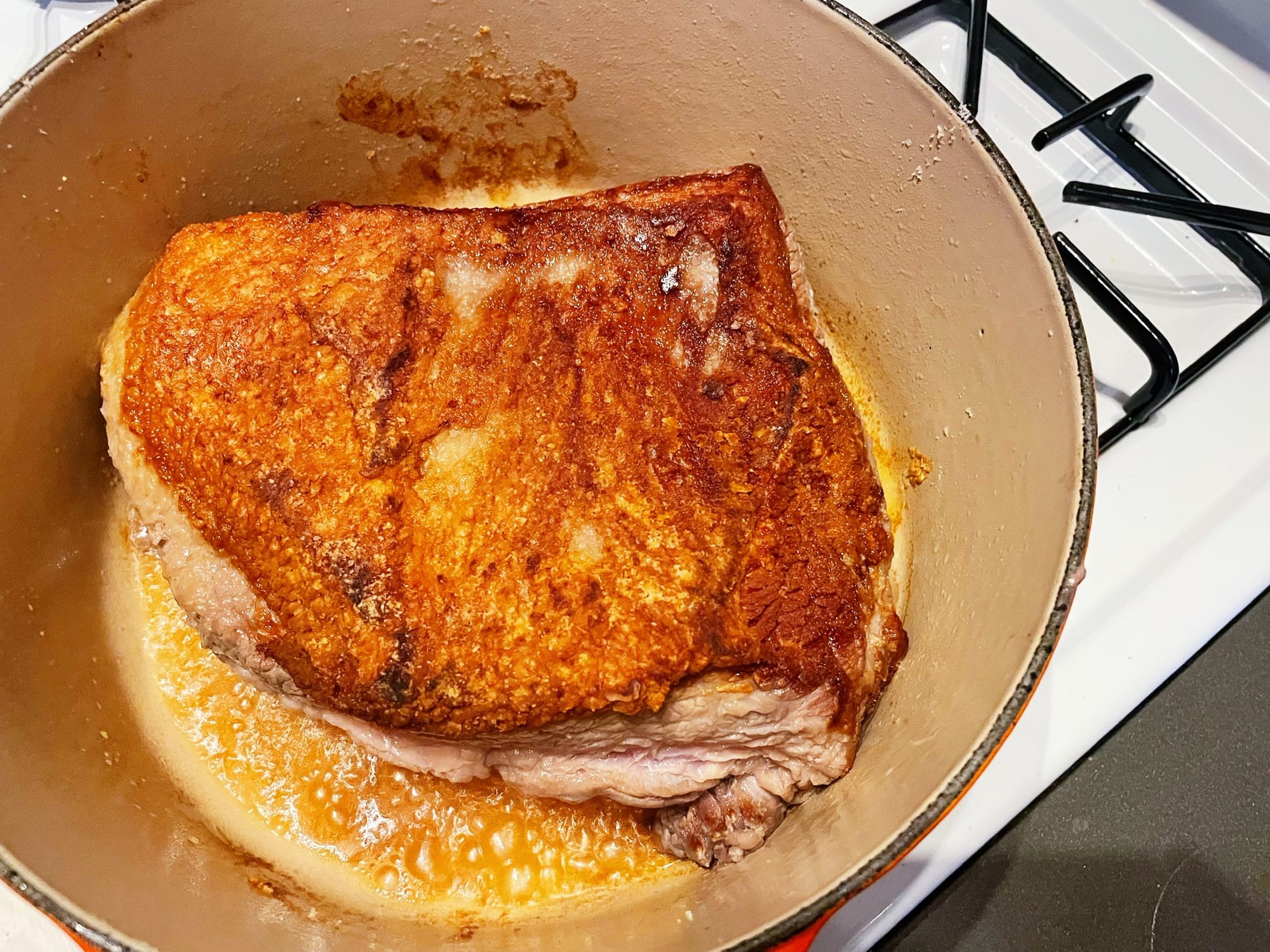 7. Bring to a simmer and place the lid on. Transfer to the oven and let it gently braise for 3–3 ½ hours. Remove from the oven and make sure it’s done by inserting the tip of a knife into the thickest part– it should meet no resistance, the whole slab jiggling like jell-o.