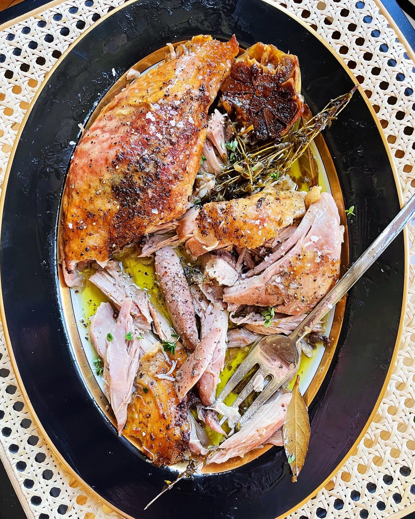 - Drain any liquid that’s come off the turkey and pat dry a little. Scatter garlic and herbs around the turkey and cover with duck fat and olive oil. Season again with salt and pepper (just like your pasta water should be seasoned, so should the fat you cook in) and cover with foil.