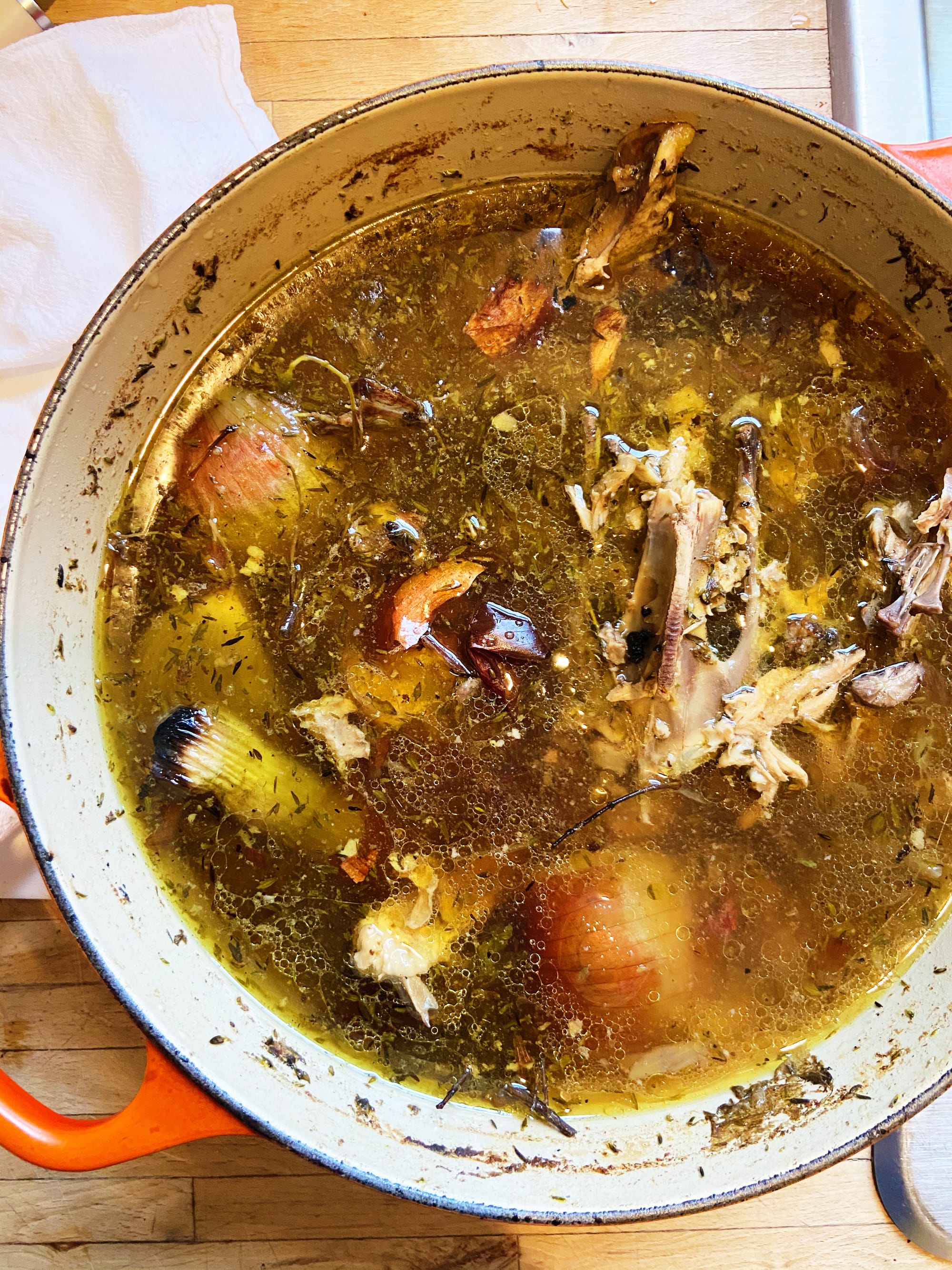 You know you absolutely love a very onion-y chicken broth, and good thing because you have approximately 14 onions at your disposal. Quarter one of the larger ones through the root, still leaving the skin on (this time, for the golden color it gives). If there’s anything else in the fridge you want to get rid of and that wouldn’t mind getting simmered for broth, you know what to do (add it to the pot). Resist the urge to add spices or powerful seasonings, knowing that this is your base broth, meant as a blank canvas for future brothy things and that can always come later.