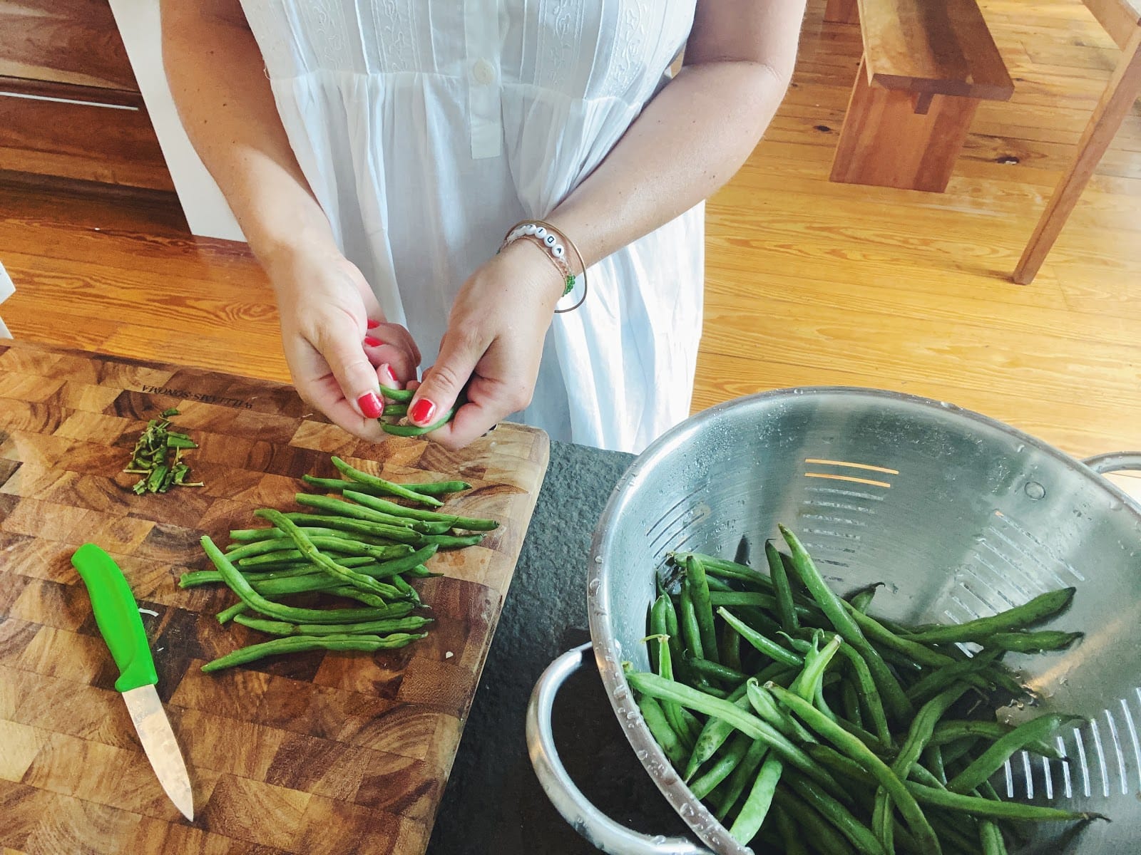 The next day, get ready for lunch and realize you only have condiments and tons of beans, so instead of going to the grocery store to stock up on essentials, go to the farm stand and buy a carton of eggs, 1 1/2 pounds of fresh, fatty tuna (because wow, surprisingly they have that?), and absolutely nothing else. I came home and put the whole piece of tuna on to slow cook, which you can read more about tomorrow if you become a subscriber to this newsletter! To my delight, I found some stowaway green beans in an abandoned grocery tote and figured if these beans accidentally traveled all the way from Brooklyn to be here, they should be a part of this meal, too (“beans and beans,” I really enjoy the sound of that). I found myself snapping the stem stem ends off (I leave the tail, it’s cute and doesn’t bother anyone) while listening to folklore and wearing that child bride ghost dress, living in a simulation.