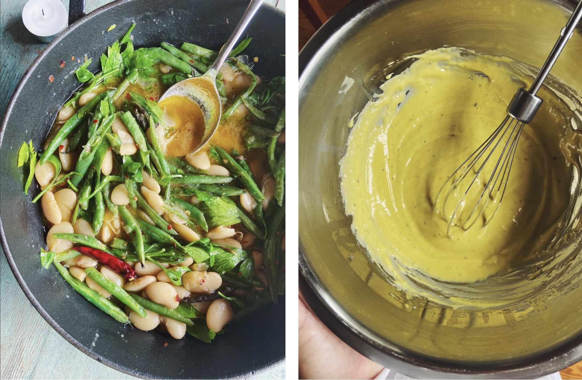 For the Beans on Beans experience, it is absolutely what I’m sure you’re expecting here, which is: beans 1 + beans 2. Char the de-stemmed green beans in a large heavy bottomed pot or skillet until they’re just cooked and blackened in spots and add the brothy beans with some of their broth (if you’re using canned beans, drain and rinse them, then add to the green beans with a thinly sliced onion and about 1/2 can of water). Let them simmer gently in this for a few minutes so everything can get to know each other. Season the pot with vinegar and a few chopped anchovies at the end because I promise you, they really did need it (if you don’t eat anchovies, a dash of soy sauce would be nice). Finish with fresh herbs if you’re looking to use some up, but they aren’t totally necessary here (the first time in my life I’ve ever said that). There was a ton of savory, very delicious, and surprisingly unfishy olive oil from what I cooked the tuna in, so I make garlicky aioli with it. It was good, but couldn’t help but think of my friend Lauren’s aioli and how it’s always so much better than literally any other aioli, so I texted her “I love you and your aioli!” (Lauren is opening a market + cafe in Hudson called Kitty’s. I don’t live there, but that’s okay, I will be driving three hours from Brooklyn just for her food, and so will you).