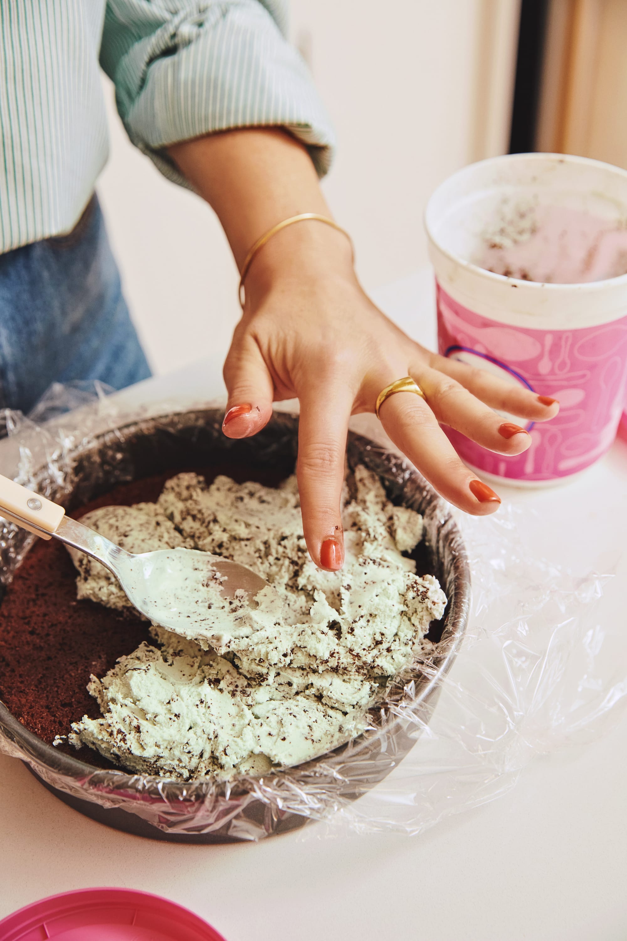 2. Let the ice cream soften on your counter for 10 minutes or so—you want the texture to be slightly softer than simply “scoopable” but decidedly not “melted.” Spoon the ice cream out onto the cake and place a piece of plastic wrap directly on top. Use your palms to smush the ice cream down, making sure it’s in one even layer. (You could use a spoon, but using your hands is faster and honestly more fun.) Place it in the freezer while you make the whipped cream.